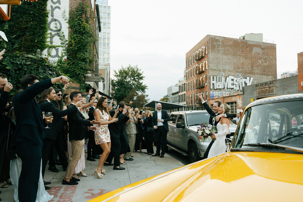You cannot have a New York wedding album without it. A and C used a classic NYC yellow cab for some fun pictures. Those shots - A's dress flowing on the pavement, C helping her in, and that bright yellow taxi against the Brooklyn backdrop - were definitely some of the best from their portrait session.
